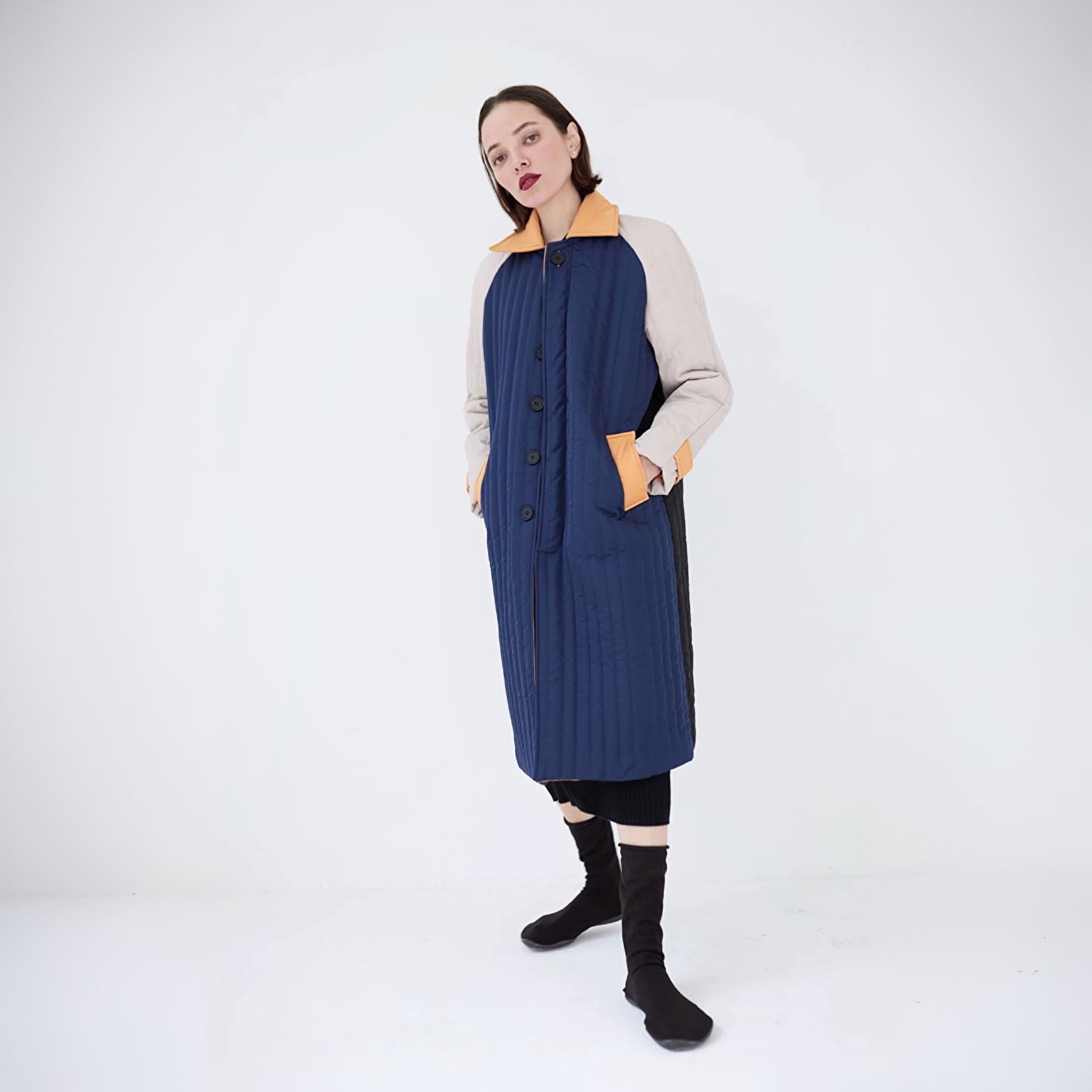 A contemporary take on the classic trench coat, featuring a striking color block patchwork design with vertical quilting. This piece combines a modern fit with a practical, long padded jacket.