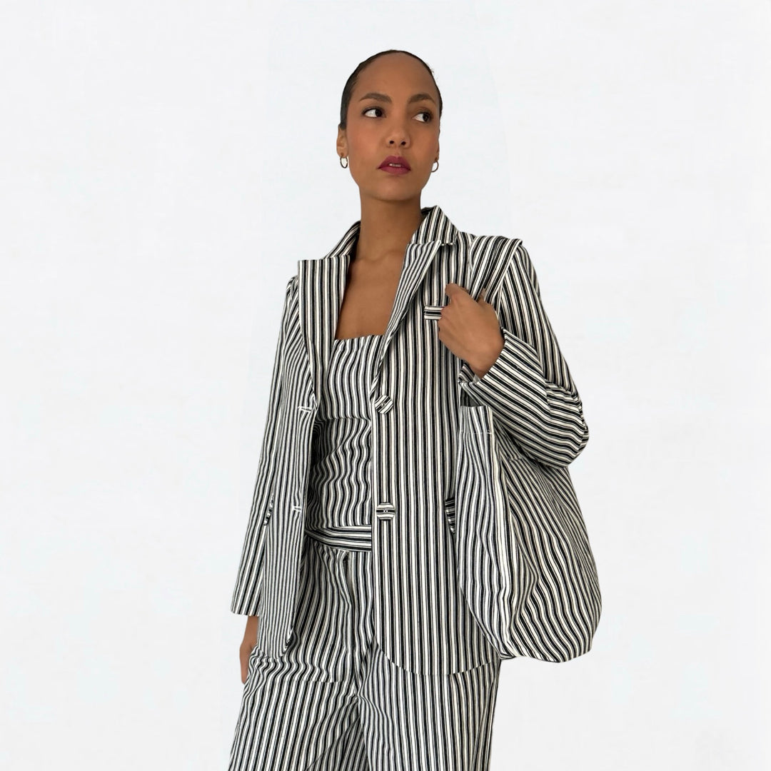 A coordinated four-piece set featuring clean lines and bold stripes. The set includes a tailored blazer, straight-leg trousers, a strapless corset top, and a practical tote bag. Each piece can be purchased individually.