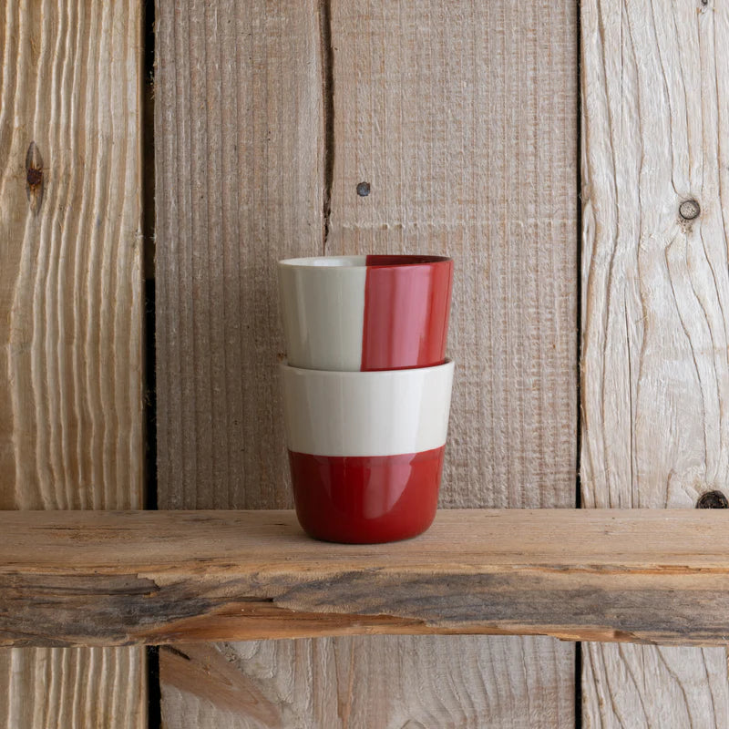 Each pair of Rue Beakers is individually hand-dipped in a smooth slip glaze, a traditional ceramic technique where the vessel is lowered by hand into liquid glaze, creating natural, flowing lines that make every piece unique.