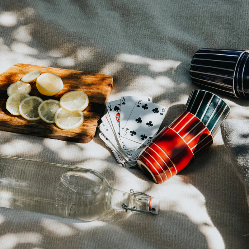 The surface is etched by hand with distinctive vertical and circular lines, giving each beaker its own character. After etching, the pieces are hand-dipped into bold, vivid glazes, resulting in subtle variations that speak to the beauty of the handmade.