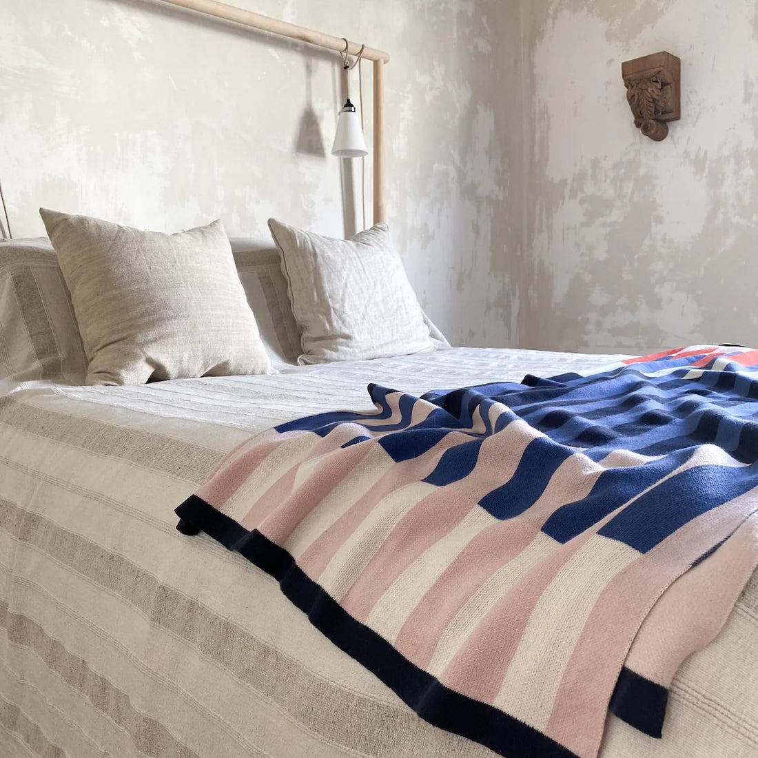The colour combination of navy, tomato red, cobalt, pink, and ivory has long been a customer favourite, and so this throw will likely sit well with cushions and blankets you have bought from us previously.