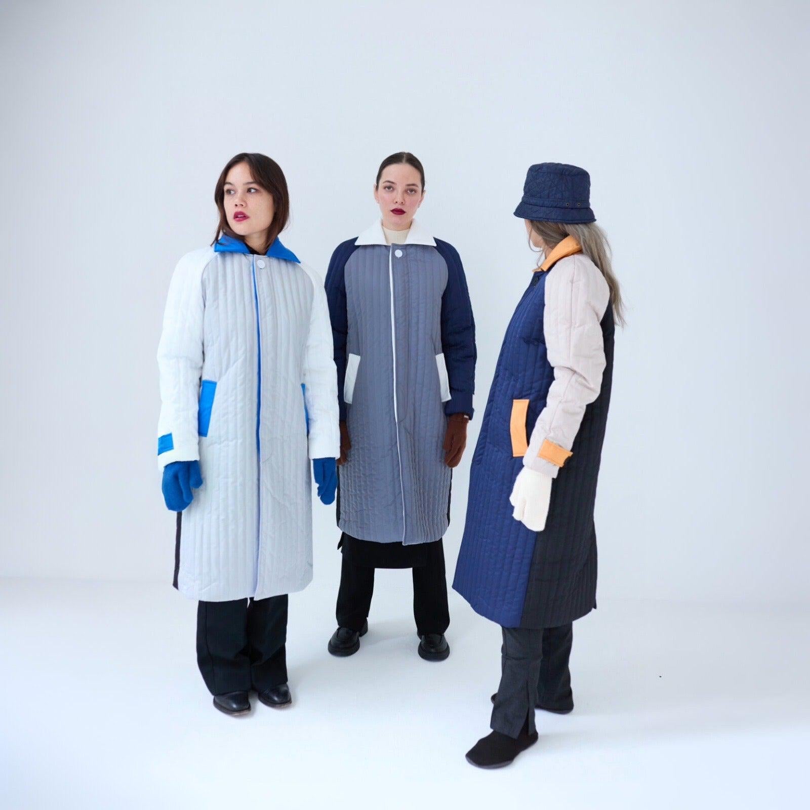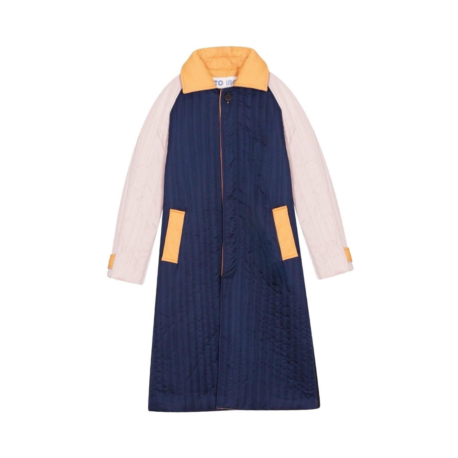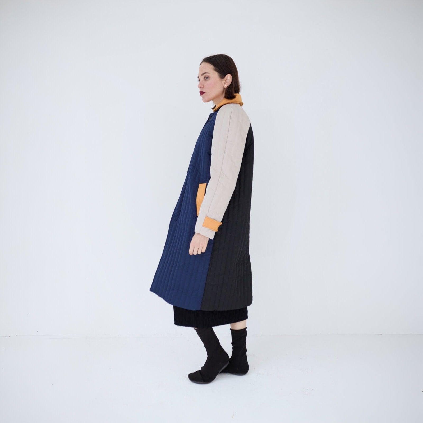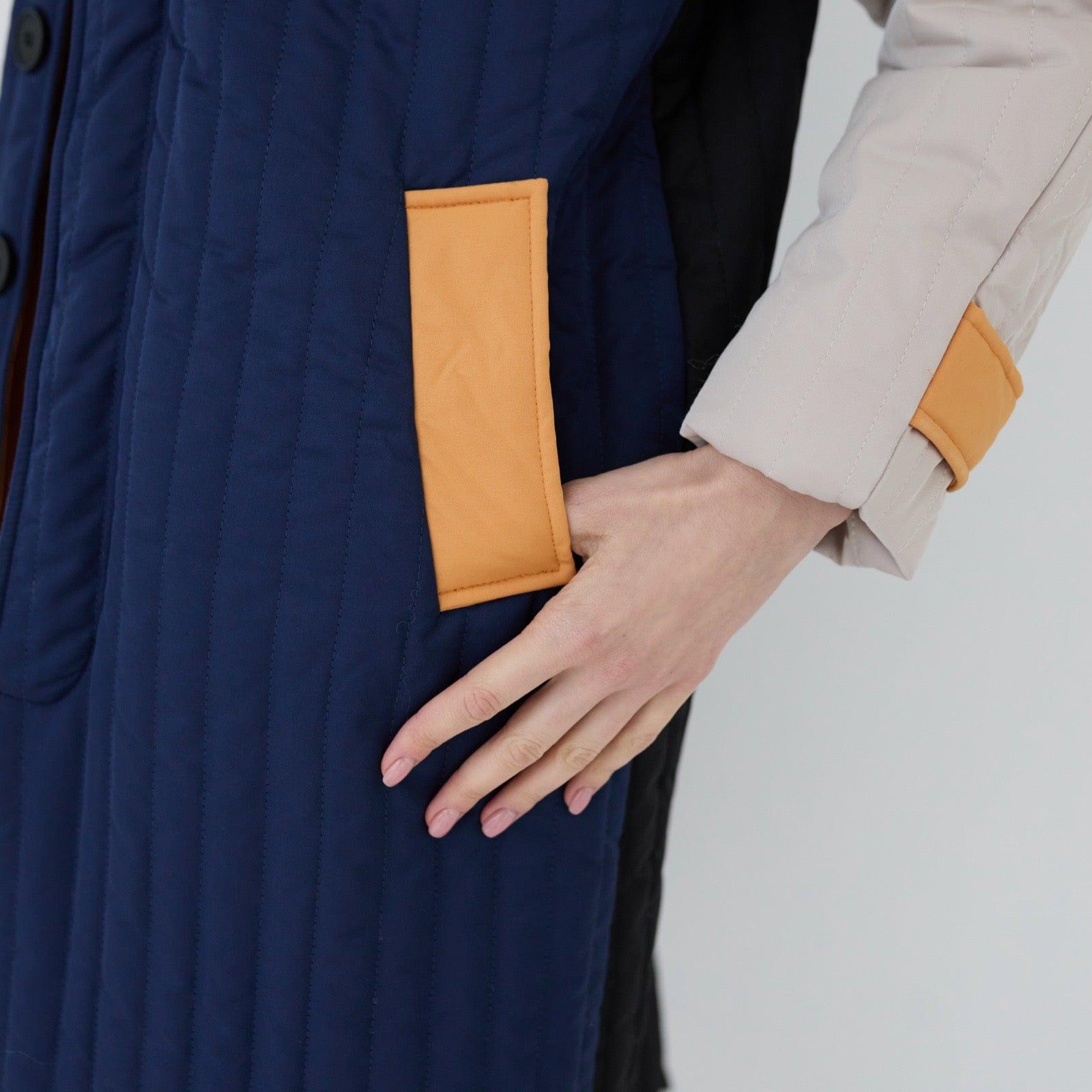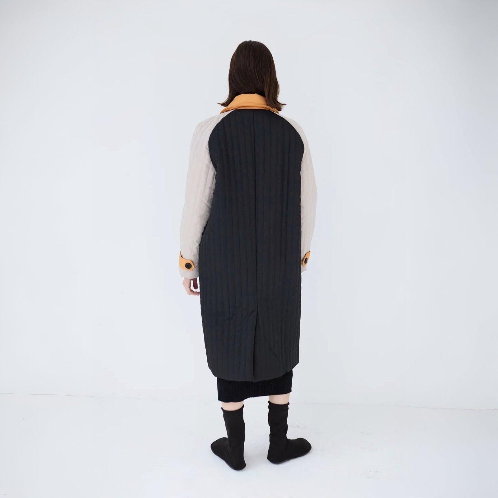Color block patchwork long trench jacket with vertical quilting pattern, contrasting colors and lining