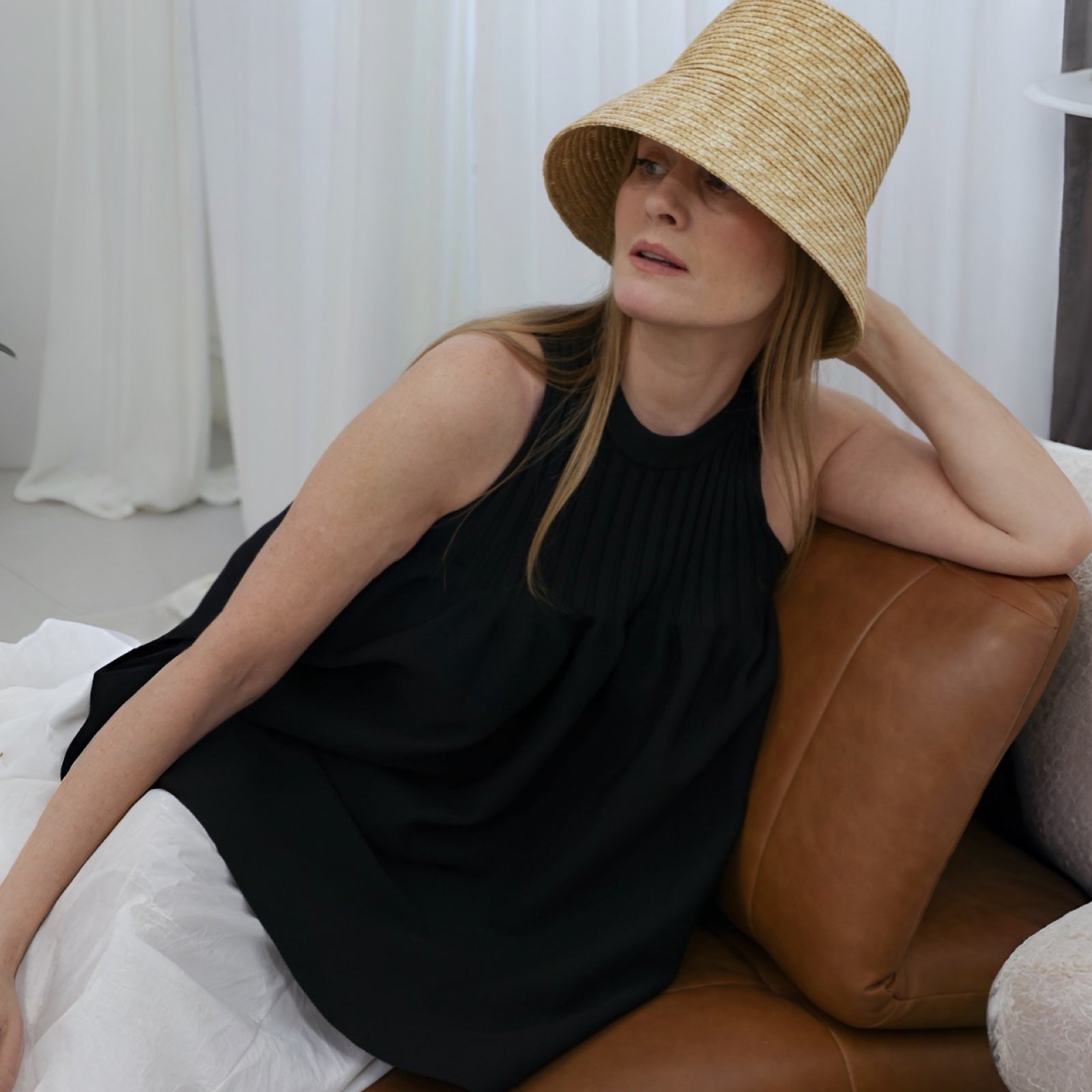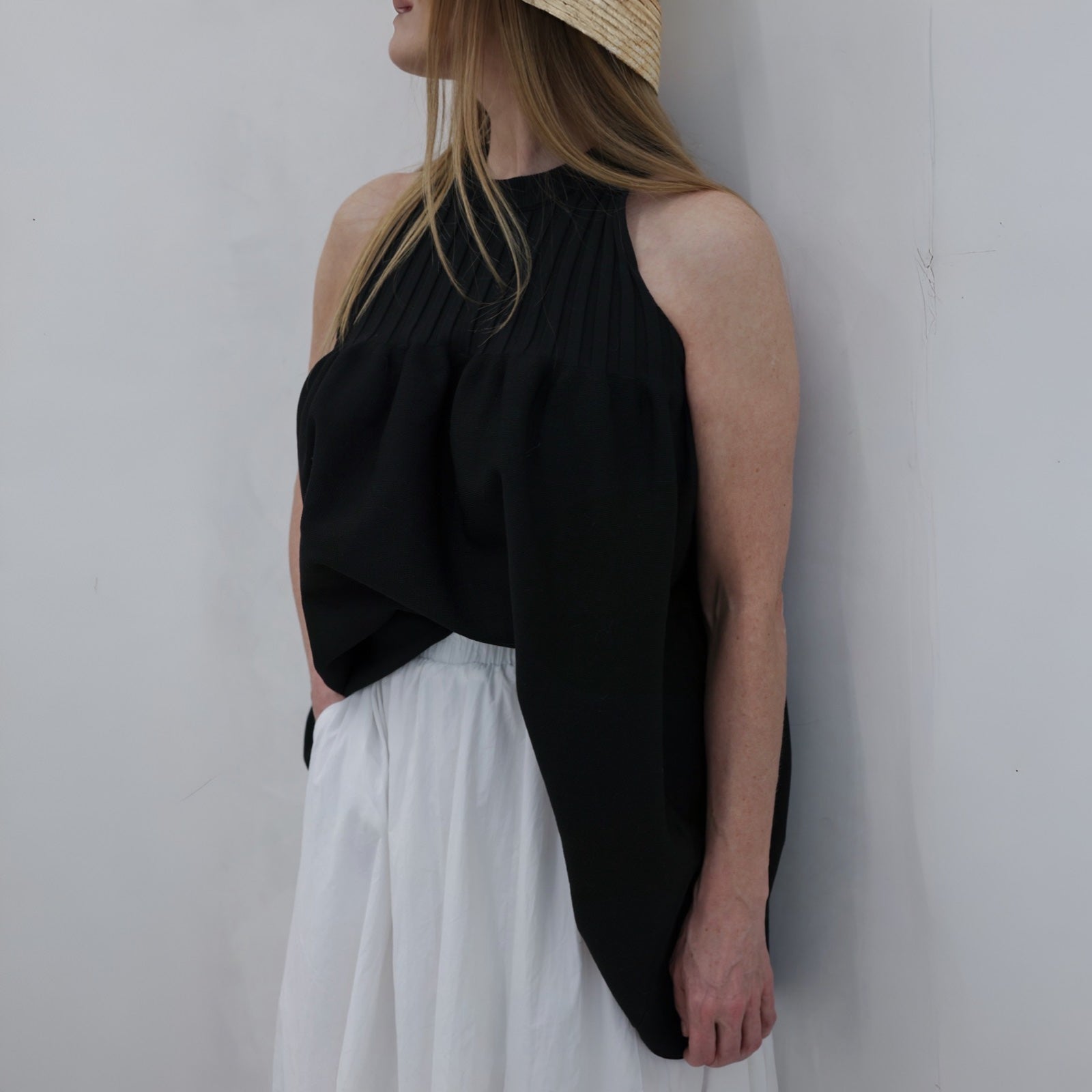 Tulip shaped ribbed halter top in black, with gathered pleating and pottery flare.