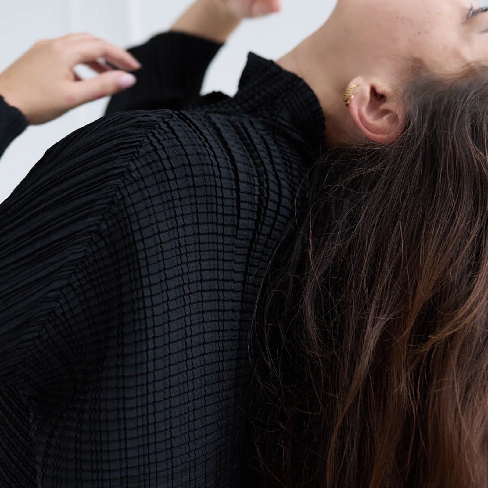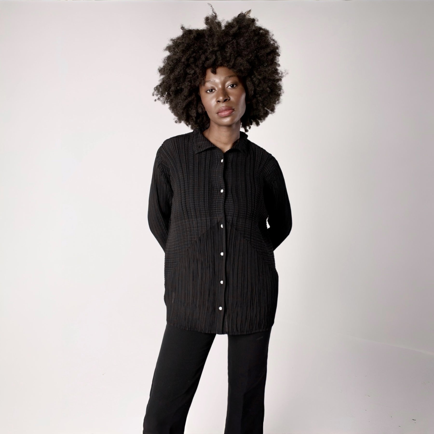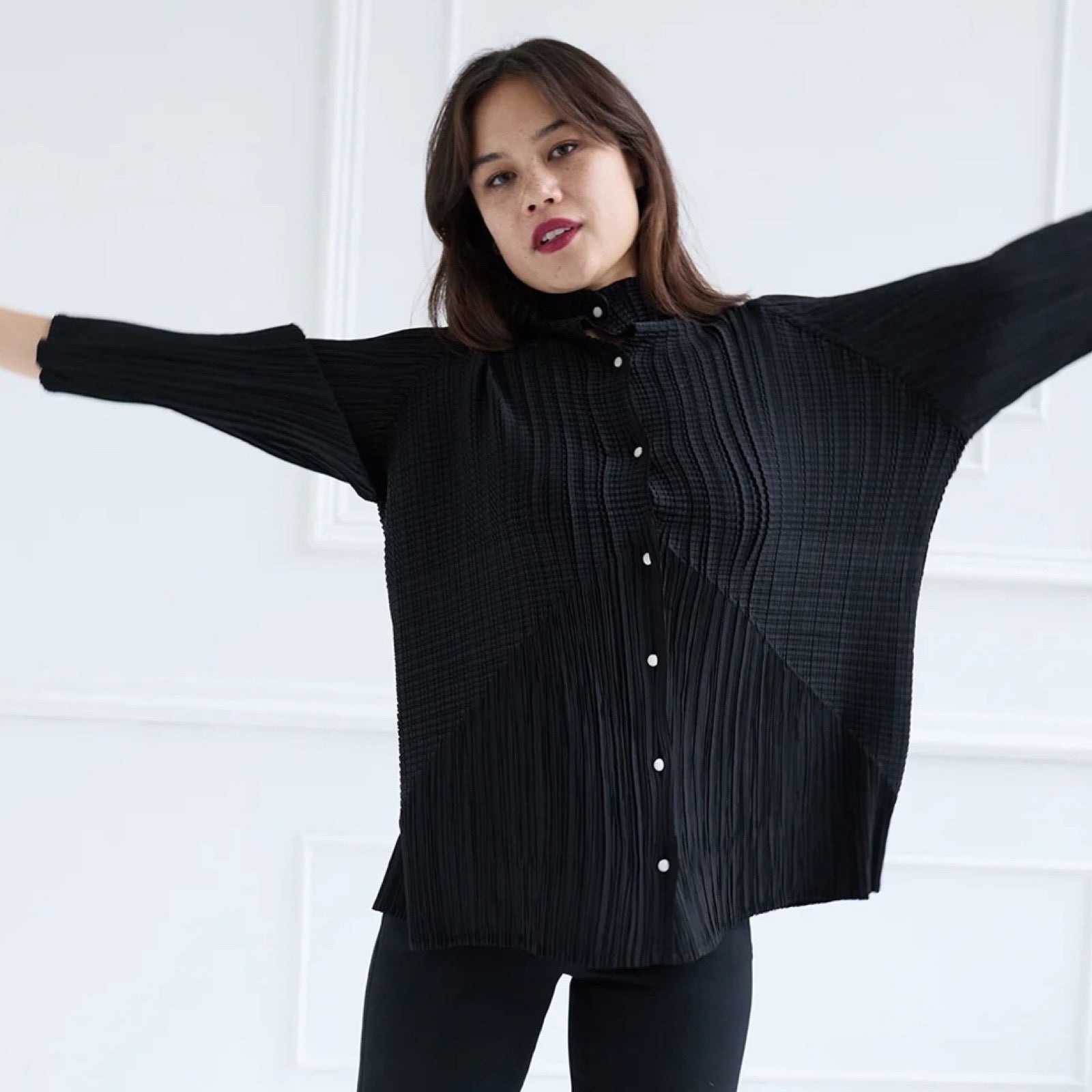 A sophisticated black blouse featuring multidirectional pleats and white button closure at the front. The flowing design adapts to different body shapes while maintaining its architectural silhouette.