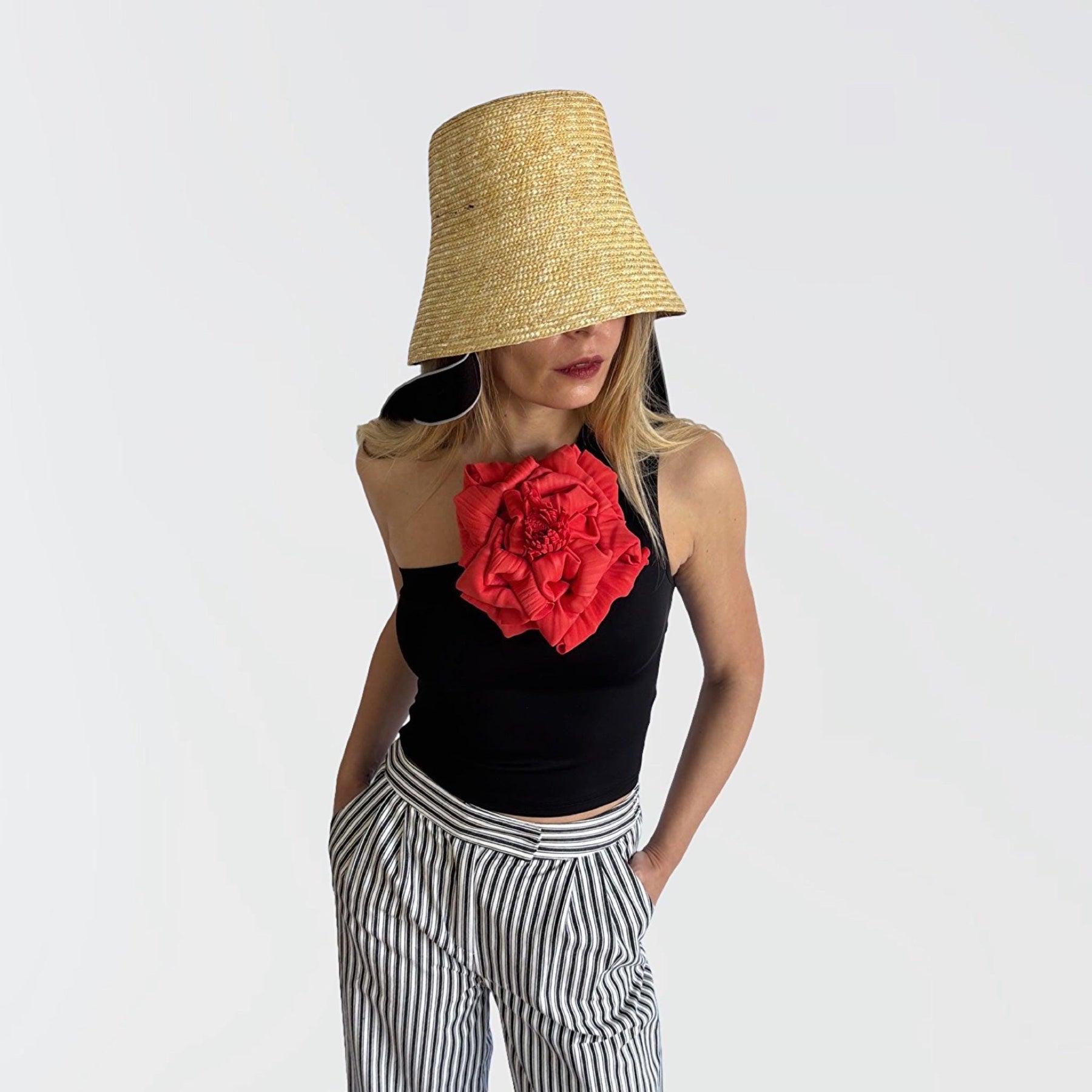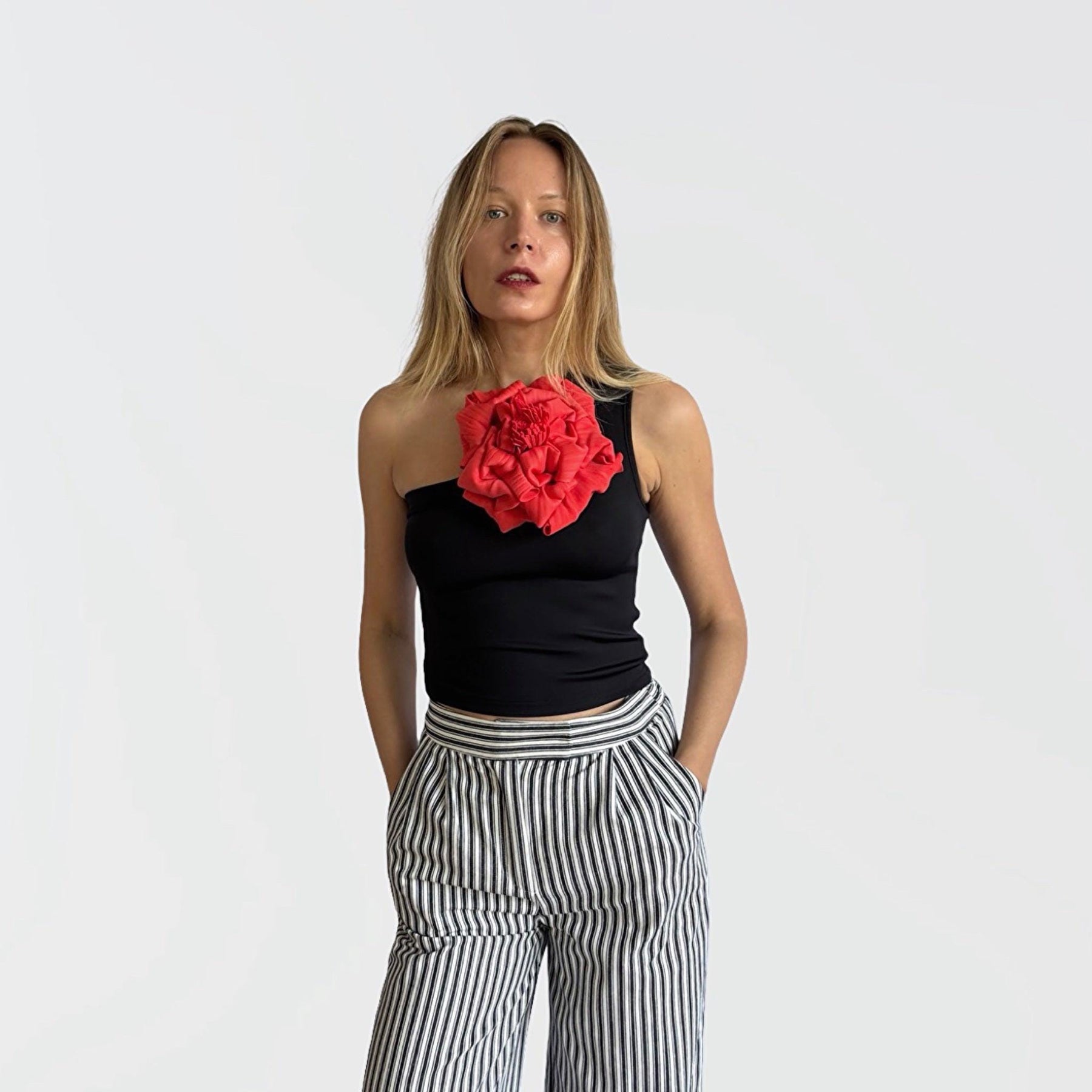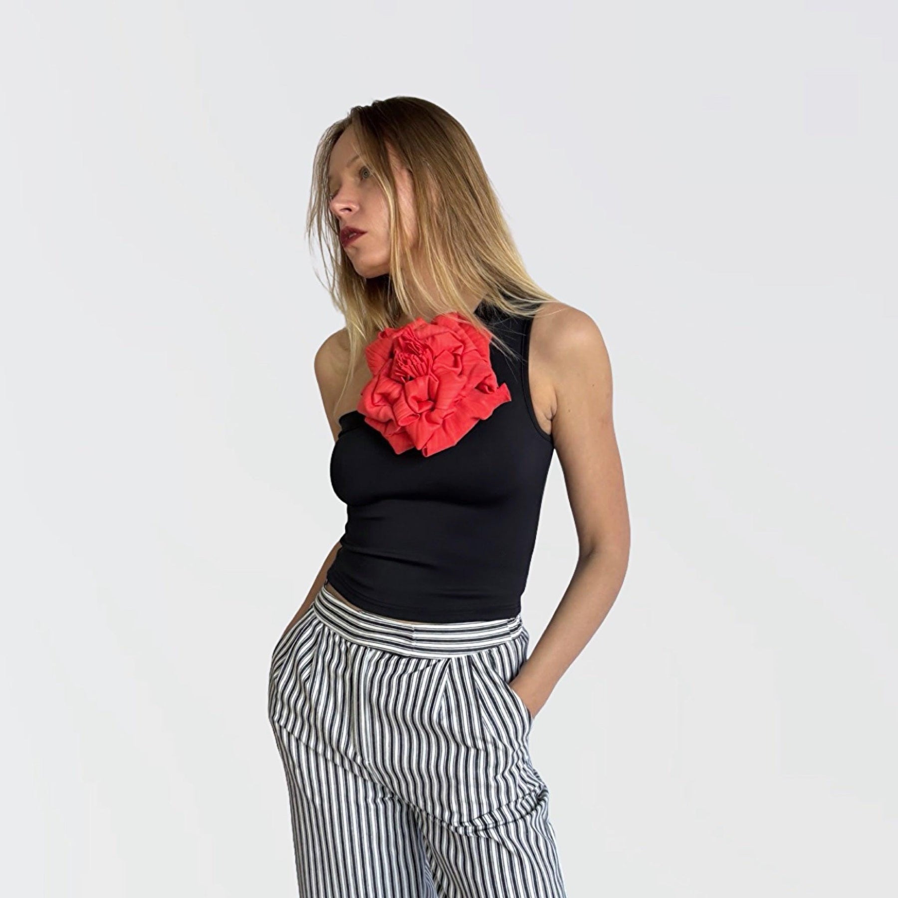 A sleek black one-shoulder top featuring a statement red flower pin. The form-fitting fabric shapes and flatters while maintaining comfort and flexibility.