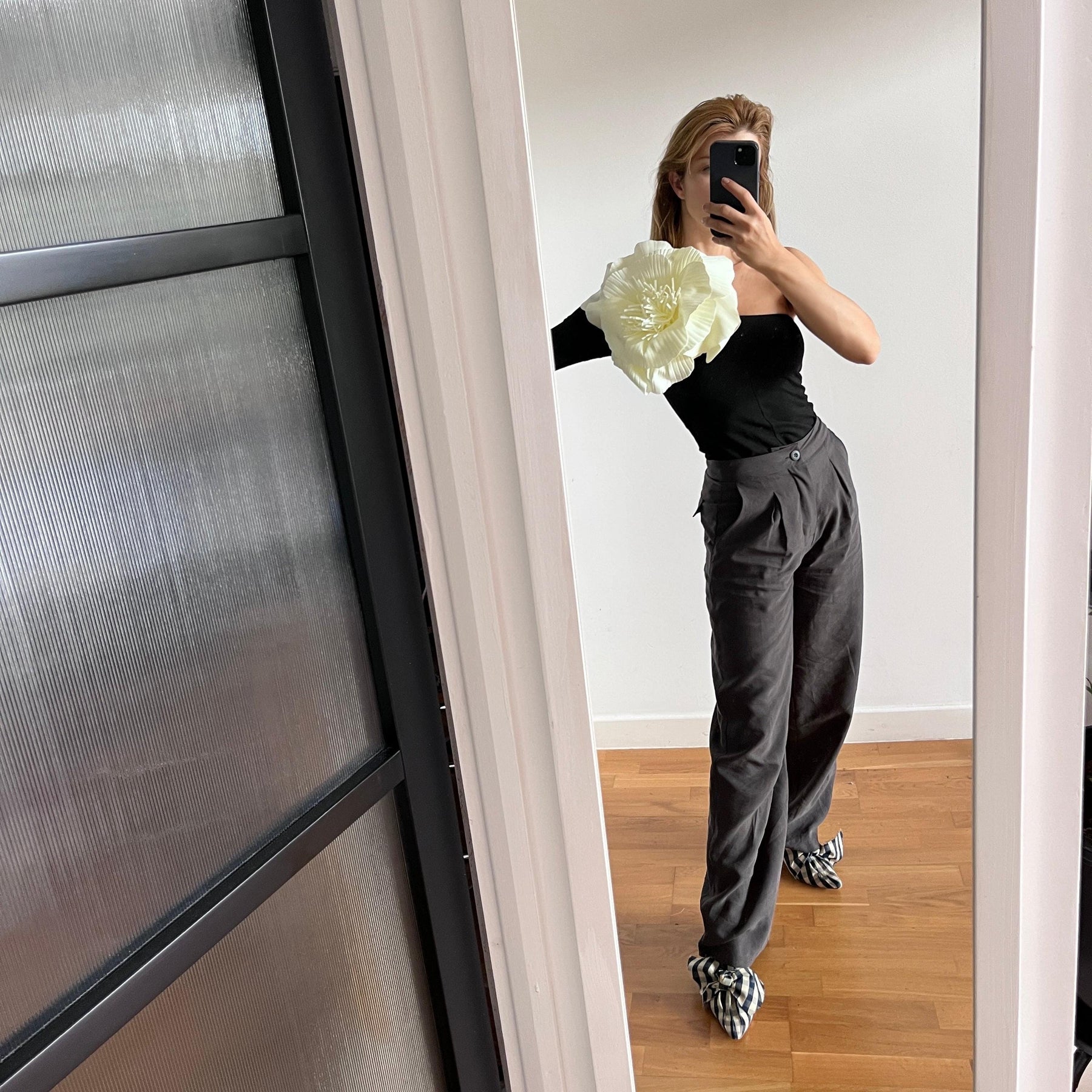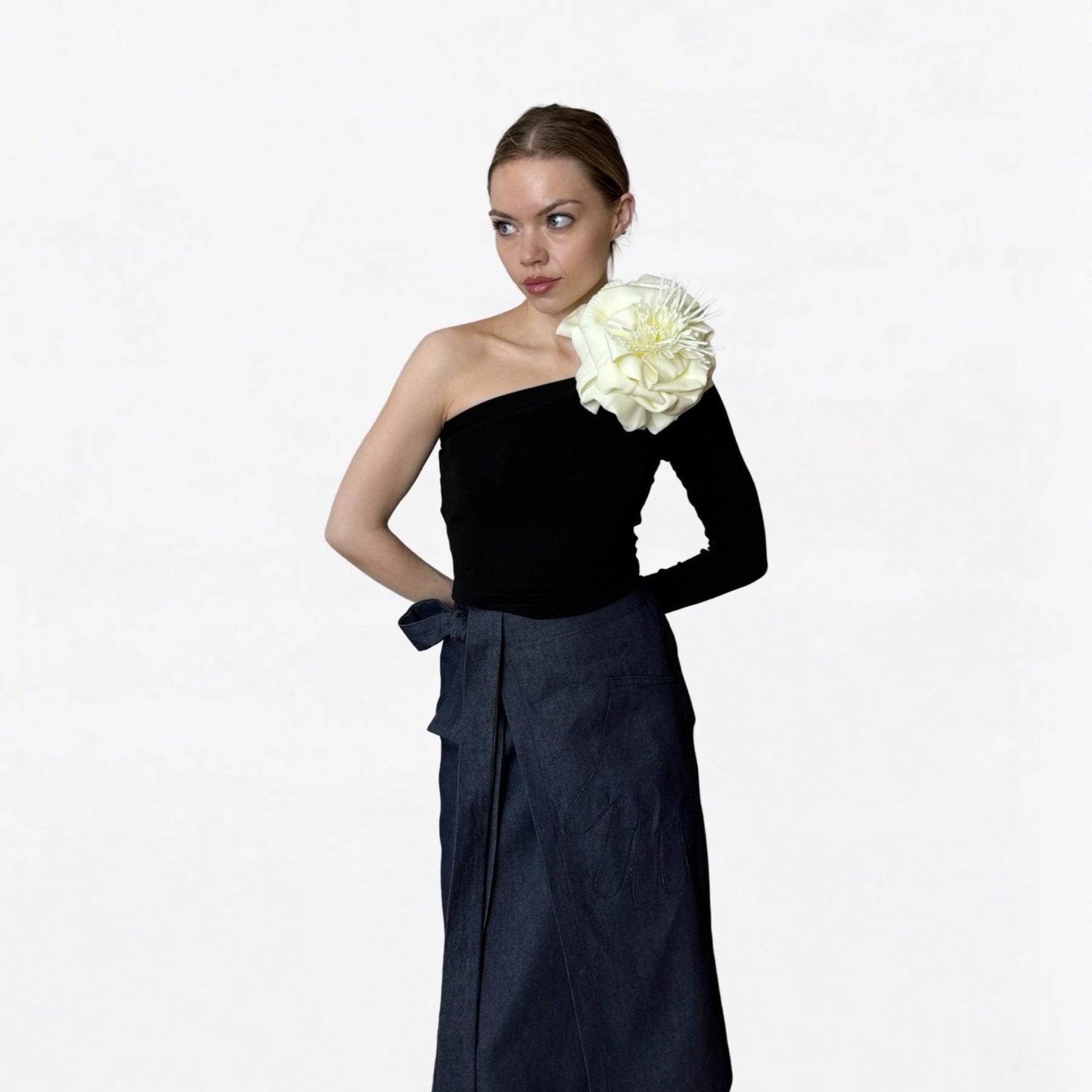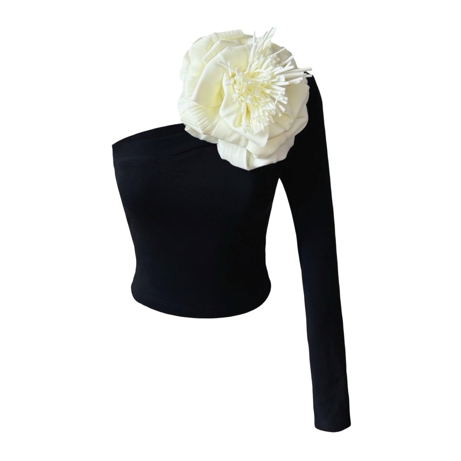 Black top with a single sleeve, featuring a statement white flower pin that can be shaped and detached. Made from heavyweight jersey cotton that holds its shape while staying comfortable.